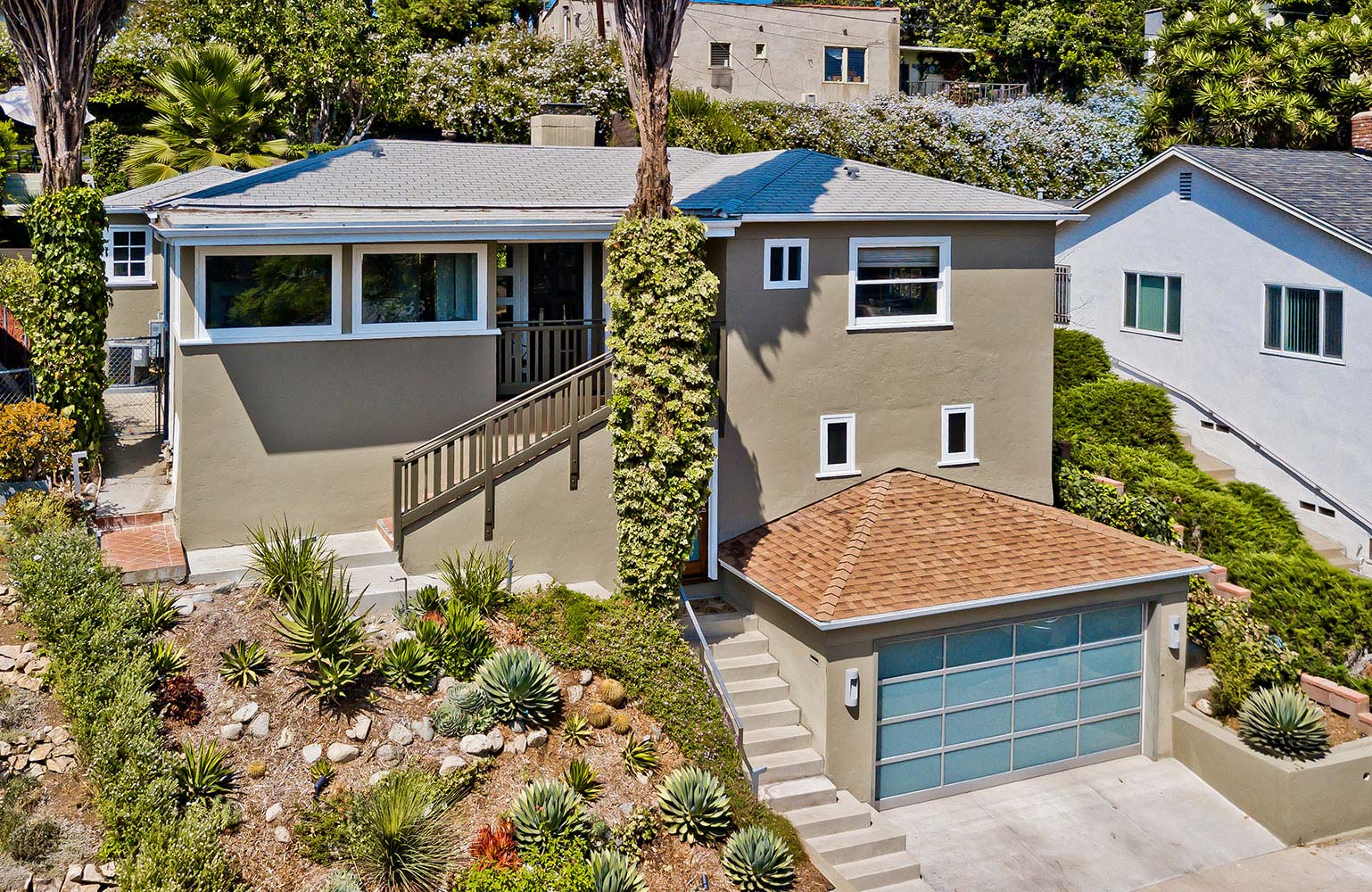 Set on a tranquil street in the sought-after Silver Lake hills, this designer-renovated home is your private escape in the heart of LA. Relax and breathe in this airy open plan with its subtle Mid-Century feel. All doors lead to delightful outdoor spaces that flow into the mix. Nearby, curving steps climb to the pièce de résistance: a broad, grassy upper yard with a producing avocado tree … and an exhilarating vista over the rooftops below. Among the home's many enhancements are a gourmet kitchen with top-of-the-line appliances; built-in Bose surround sound; gas fireplace; updated plumbing and electrical; and eco-friendly touches like bamboo flooring, a tankless hot water heater, and newer high-efficiency HVAC. A lower finished bonus room that measures some 300 square feet is ready to become whatever you want it to be. Your personal retreat is moments from the cafes and shops of Sunset Junction and relaxing strolls around the reservoir.